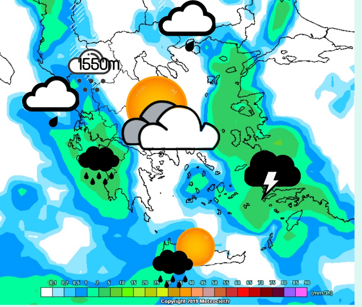 Αυξημένες συννεφιές κατά τόπους σε όλη την χώρα, ενώ βροχές θα σημειώνονται στα δυτικά και κυρίως την Πελοπόννησο. Χιονοπτώσεις στην Πίνδο πάνω από τα 1550 περίπου μέτρα. Παραμένει ο αστατος καιρός στο Αιγαίο, ιδιαίτερα στο Ανατολικό, με μπόρες και τοπικές καταιγίδες. Πρόσκαιρες βροχές και στην Θράκη. Σε κεντρική Μακεδονία, Θεσσαλία και ανατολική Στερεά, ο καιρός θα είναι καλύτερος με πολύ μικρή την πιθανότητα ασθενούς βροχής. Ενισχύονται οι νοτιάδες στο Ιόνιο από το απόγευμα, και από την νύχτα στο Αιγαίο. ( Πηγή χάρτη: meteociel. fr)