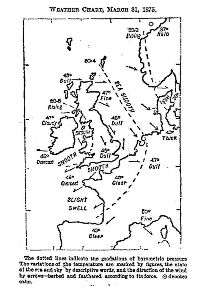 Ο πρωτος χαρτης προβλεψης καιρου που εμφανιστηκε σε εφημεριδα ηταν το 1875, απο τους Ταιμς(The Times) του Λονδινου.