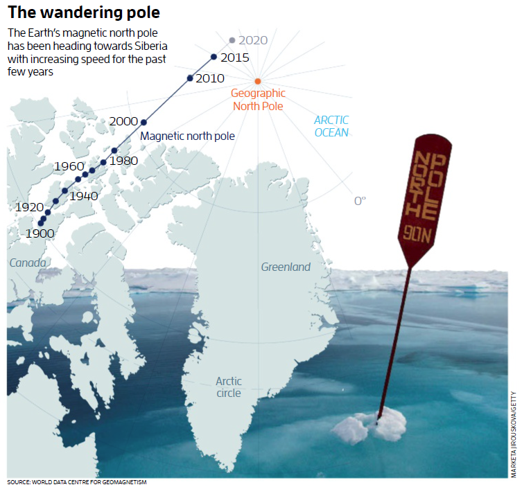Ο μαγνητικος βορειος(και αντιστοιχα και ο νοτιος) πολος της γης δεν μενει σταθερος και αλλαζει θεση δραστικα μεσα στον χρονο. Ετσι το 1900 ηταν στον Καναδα, εναν αιωνα μετα στην Γροιλανδια και τα τελευταια 18 χρονια κατευθυνεται προς την Σιβηρια με ταχυτητα 40 χιλιομετρα τον χρονο.