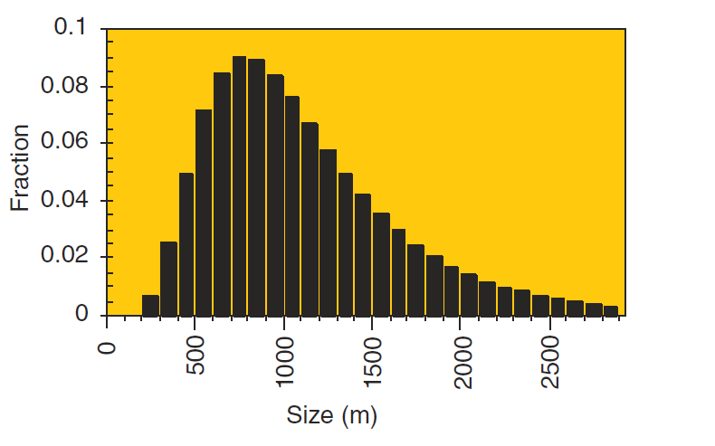 Καθε στιγμη παγκοσμιως η συχνοτητα των διαφορων σωρειτομορφων νεφων αναλογως με την διαμετρο τους ειναι η εξης. Οπως βλεπουμε η κυριαρχη διαμετρος ειναι 700 με 800 μετρα.