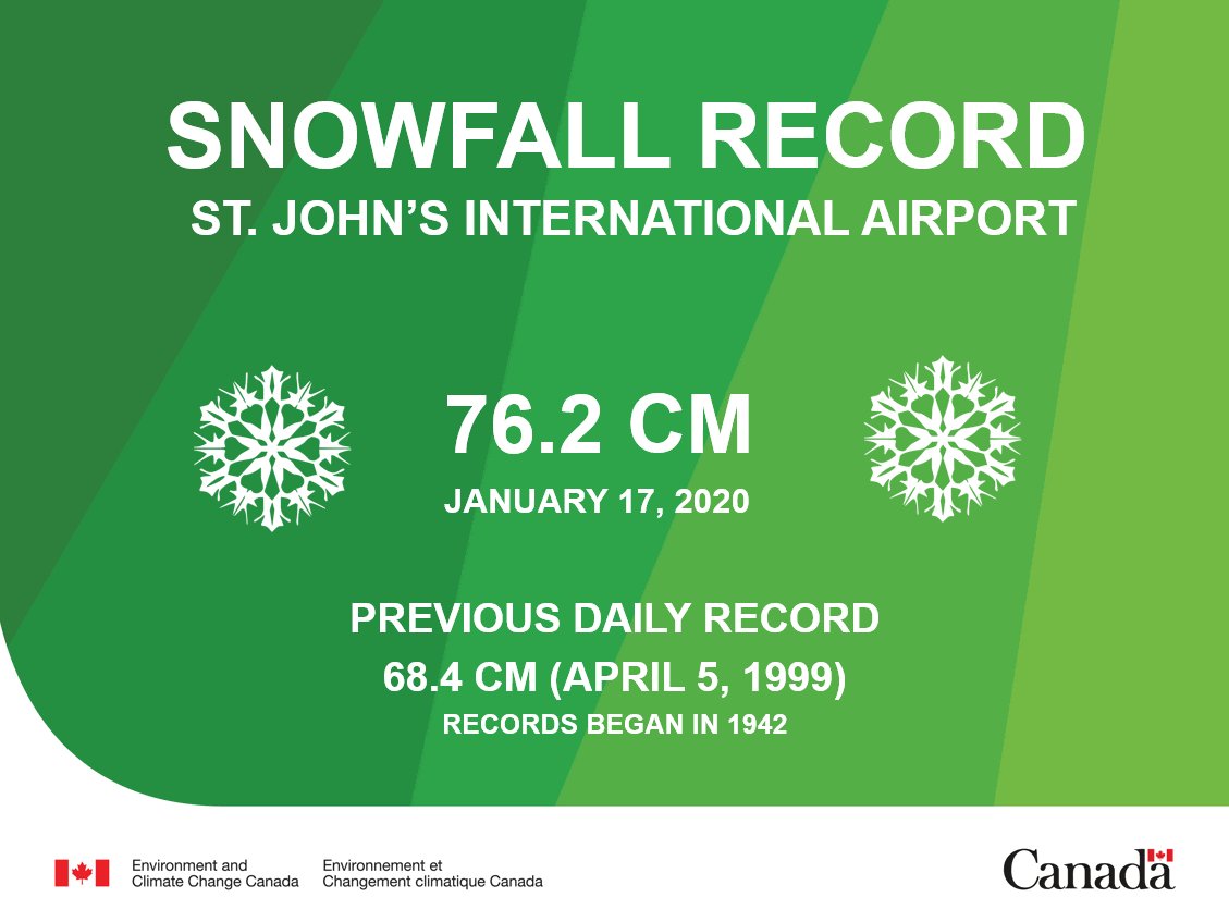 Στο αεροδρομιο του St John της περιοχης (140 μετρων υψομετρου) επεσαν στις 17 του μηνος συνολικα 76.2 εκατοστα χιονιου σε μια μερα!! Που αποτελει ρεκορ ολων των εποχων για την περιοχη. Και χιονισε πολυ και στις 18 του μηνος.