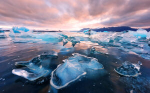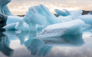 Όταν ο ήλιος αντανακλά πάνω στους μικροσκοπικούς κρυστάλλους πάγου, τα παγόβουνα παίρνουν ένα υπέροχο μπλε χρώμα. Το κίτρινο και το πορτοκαλί παίρνουν τη δική τους θέση πάνω στα παγόβουνα, κατά το ηλιοβασίλεμα.