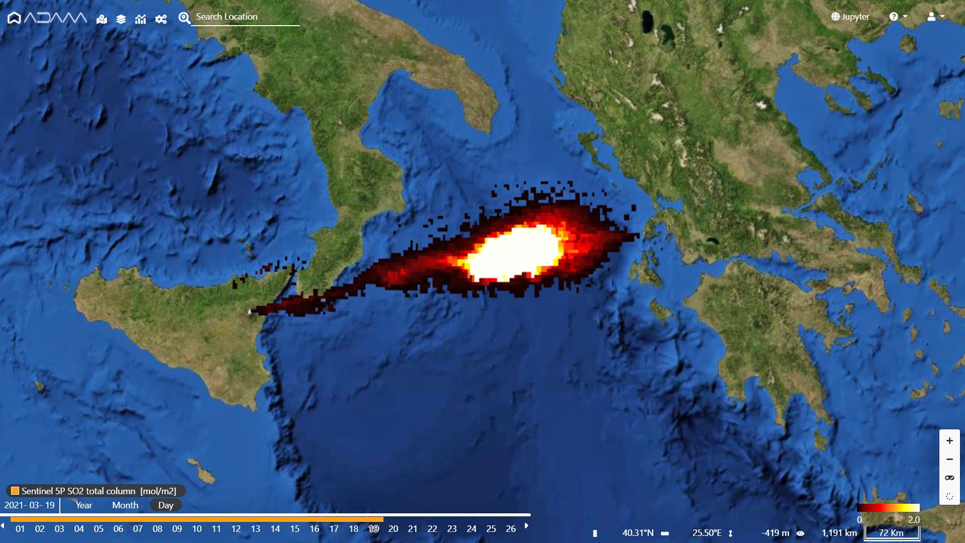 Μεγαλες ποσοτητες τεφρας και αεριων εκτοξευτηκαν στην ατμοσφαιρα, ενω πυκνο στρωμα με διοξειδιο του θειου εφτασε στην Ελλαδα το μεσημερι οπως φαινεται απο τις δορυφορικες εικονες στα διάφορα φασματα.