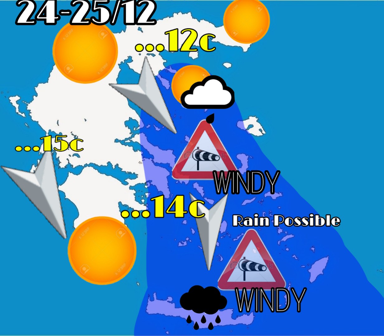 Φτάνοντας περίπου μία εβδομάδα πριν τις γιορτές, και συγκεκριμένα τα Χριστούγεννα, μπορούμε να πούμε επιγραμματικά, το πώς φαίνεται να κυλάει ο καιρός το διάστημα εκείνο στην χώρα μας. Χωρίς περισσότερες σάλτσες, μπαίνουμε κατευθείαν στο ψητό! Όπως βλέπουμε και στον χάρτη, η ηλιοφάνεια θα κυριαρχεί στα δυτικά κεντρικά και βόρεια, καθώς στις 23-24 θα έχει προηγηθεί δυνατός βοριάς. Εξαιρετική διαύγεια και ορατότητα στην ατμόσφαιρα, καθώς η υγρασία θα είναι σε πολύ χαμηλά επίπεδα. Κυρίαρχοι άνεμοι οι βοριάδες. Προχωρώντας ανατολικότερα, οι συννεφιές θα πρέπει να έχουν την κατανομή βορείου ρεύματος. Έτσι οι περισσότερες συννεφιές θα εντοπίζονται στο Αιγαίο. Πολύ δυνατοί οι βοριάδες, πιθανόν να προκαλέσουν προβλήματα στις ακτοπλοϊκές συγκοινωνίες. Αυτό θα το δούμε και τις επόμενες ημέρες, απλώς έχετε το κατά νου. Η πιθανότητα βροχών, θα εντοπίζεται κυρίως στο Αιγαίο και τα νοτιότερα κυρίως τμήματα του. Η Κρήτη φαίνεται να βρίσκεται στις μεγαλύτερες πιθανότητες για βροχή. Η θερμοκρασία τέλος, θα παρουσιάσει πτώση ιδιαίτερα στα βόρεια και το Αιγαίο.