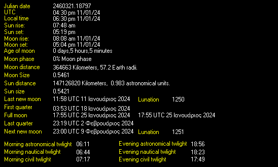 Ανατολή Σελήνης: 01:24 Δύση Σελήνης: 13:08 Φθίνουσα Σελήνη 35 Φωτεινότητα |