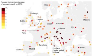 Εξαιτίας της παγκόσμιας υπερθέρμανσης, η μέση θερμοκρασία στις ευρωπαϊκές πόλεις θα είναι αυξημένη κατά 3,5 βαθμούς Κελσίου το καλοκαίρι και 4,7C το χειμώνα. Στην Αθήνα η θερμοκρασία προβλέπεται να ανέβει 5-6 βαθμούς.