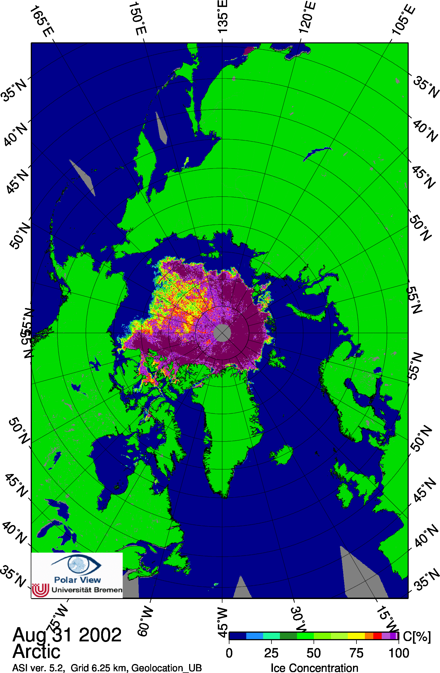 Και εδω η παγοκαλυψη στην Αρκτικη φετος 31 Αυγουστου 2020 σε σχεση με τις 31 Αυγουστου του 2002, τους ετους δηλαδη που τραβηχτηκαν οι τοτε φωτο.