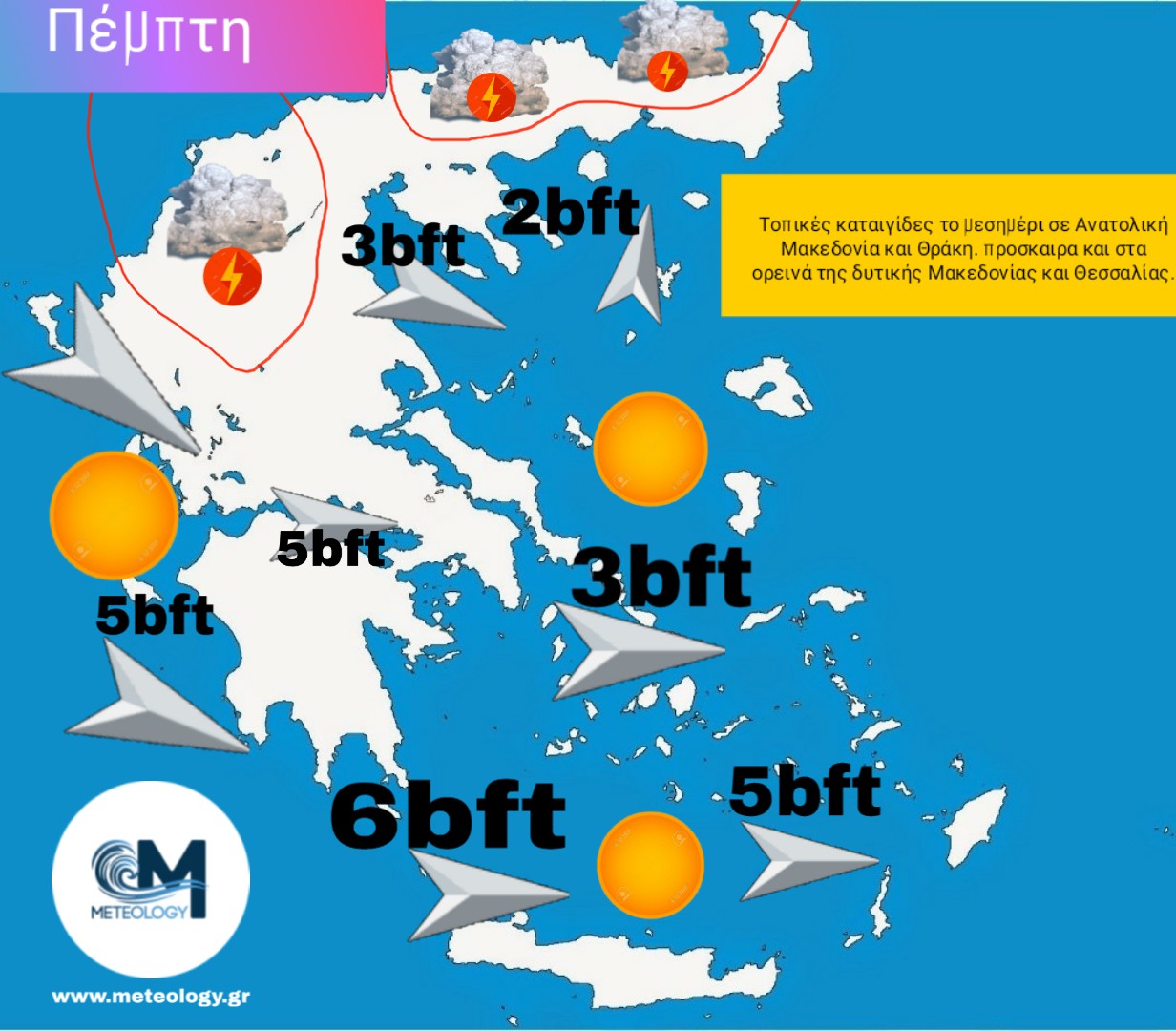 Σε φθίνουσα πορεία πλέον η αστάθεια στην ηπειρωτική χώρα, καθώς η διαταραχή απομακρύνεται ανατολικά. Έτσι, η λιακάδα θα κυριαρχεί σε όλη την χώρα και μονο στην ανατολική Μακεδονία και Θράκη, το μεσημέρι και το απόγευμα θα εκδηλωθούν διάσπαρτες μπόρες η καταιγίδες. Ανάλογα φαινόμενα μικρότερης έκτασης και σε Θεσσαλία και δυτική Μακεδονία. Οι άνεμοι από δυτικές διευθύνσεις στα νότια, έως 6 μποφόρ. Η θερμοκρασία χωρίς αξιόλογη μεταβολή. Καλός ο καιρός τόσο σε Αθήνα όσο και θεσσαλονικη, με την δεύτερη να υπάρχει μικρή πιθανότητα μπόρας στα ορεινά προς Χαλκιδική.