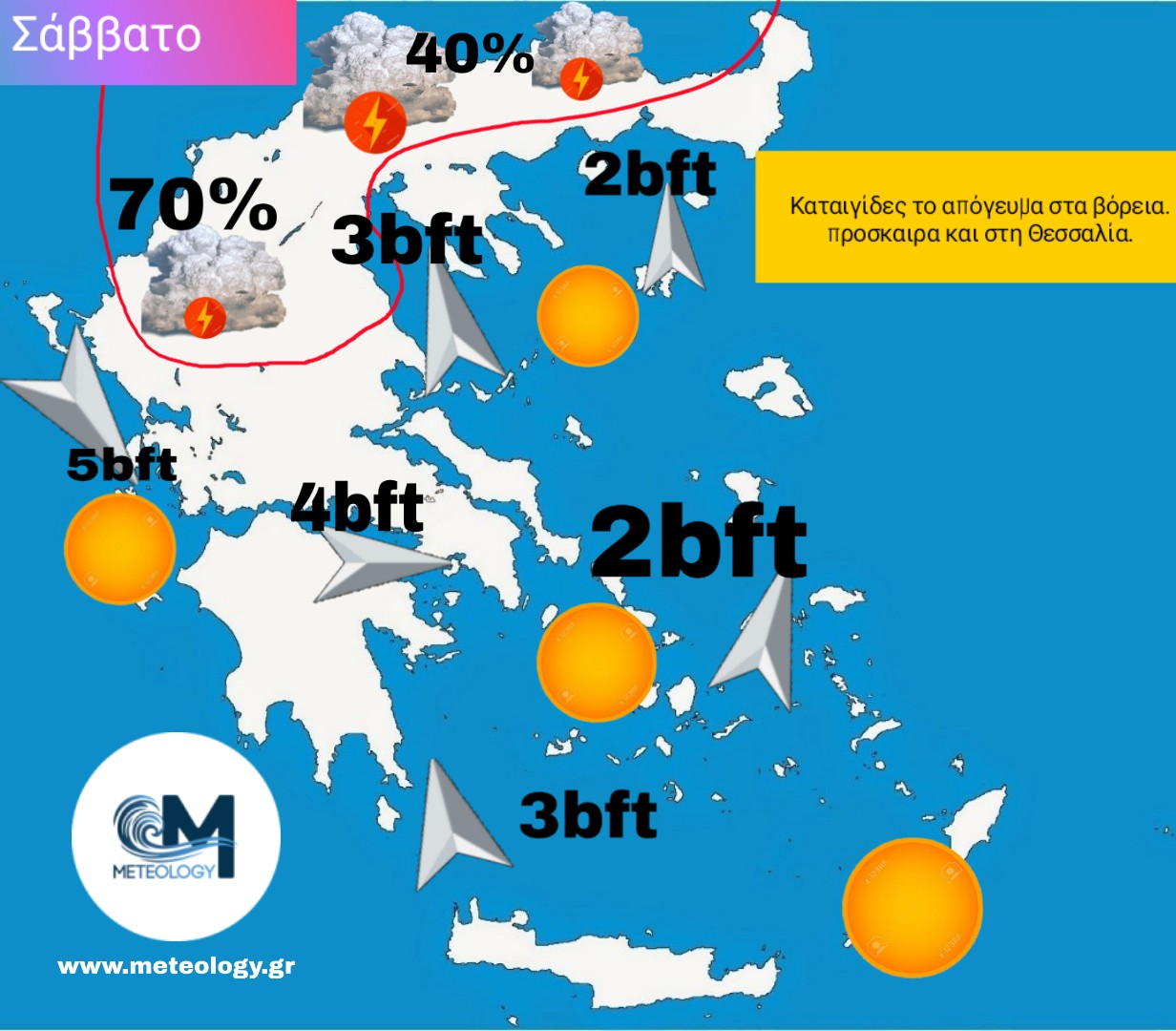 Με αραιές νεφώσεις θα κυλήσει το Σάββατο στο σύνολο της χώρας, αλλά και με μεγάλα διαστήματα ηλιοφάνειας. Προς το μεσημέρι αργά και μετά, σε Θεσσαλία Μακεδονία, Ήπειρο και Θράκη, περιορισμένη αστάθεια, πιθανόν να δώσει διάσπαρτες μπόρες και καταιγίδες. Υπαρκτή η πιθανότητα να επηρεαστεί και η Θεσσαλονίκη προς το βράδυ από ανάλογα φαινόμενα ( 30-40% πιθανότητα ). Βοριάδες στο Ιόνιο από το μεσημέρι και έπειτα, στην υπόλοιπη χώρα μεταβλητοί μέτριοι. Η θερμοκρασία χωρίς αξιόλογη μεταβολή.