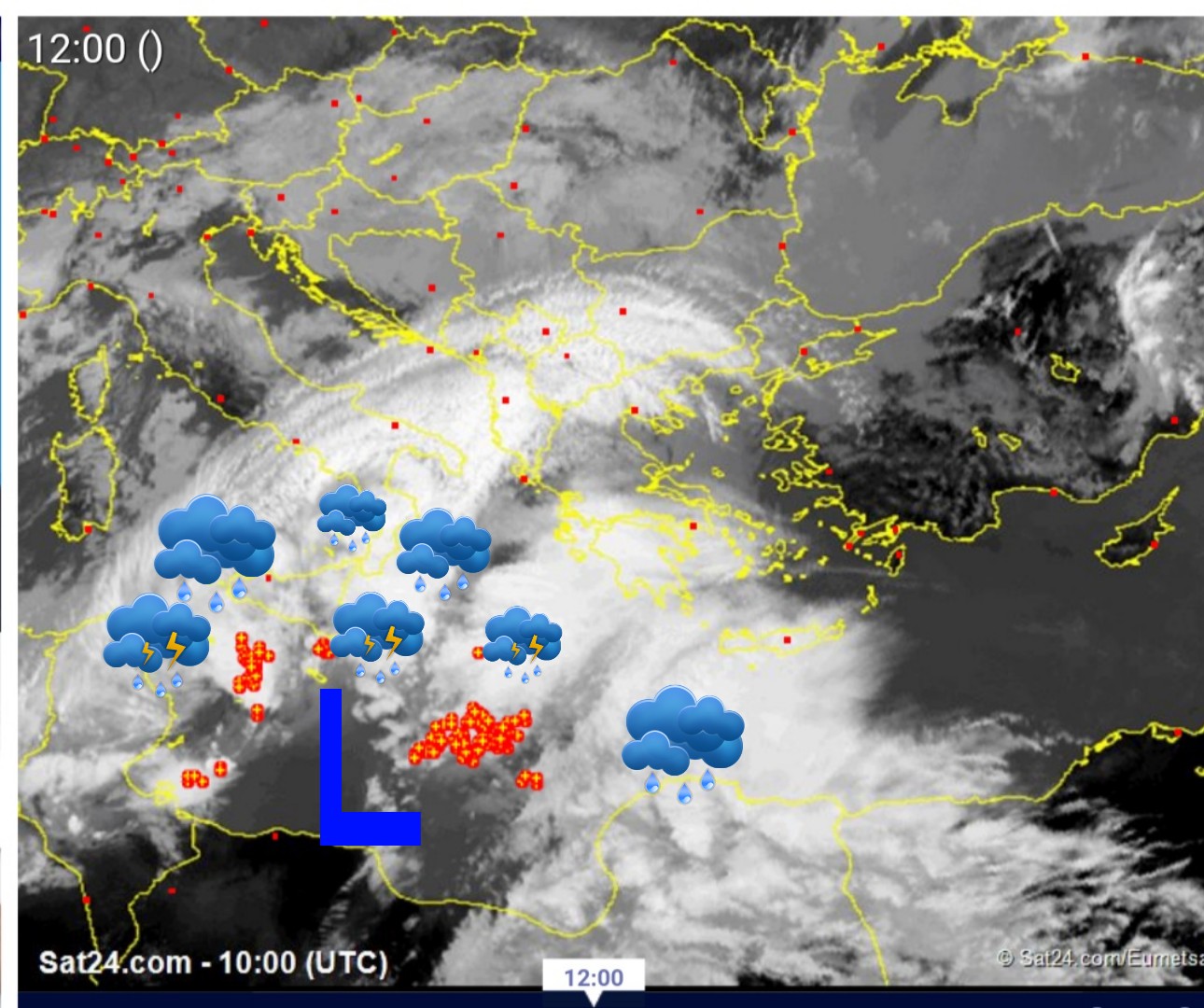 Το βαρομετρικό χαμηλό και η θέση του αυτή την ώρα στην Μεσόγειο. Το σύστημα αυτό, ένα πολύ καλά οργανωμένο “θηρίο” , αναμένεται να απασχολήσει την χώρα μας από απόψε και από την Πελοπόννησο, με πολλές βροχές φθινοπωρινού τύπου, μέχρι και το Σάββατο. Οι ψυχρές θάλασσες όπως είναι λογικό αυτή την εποχή, θα εμποδίσουν την ανάπτυξη καταιγίδων, έτσι αυτές θα τις έχουμε μόνο σε θαλάσσιες και παραθαλάσσιες περιοχές της νότιας και ανατολικής Πελοποννήσου κυρίως αύριο. Στην υπόλοιπη χώρα, οι βροχές θα έχουν ωφέλιμο ποτιστικό χαρακτήρα, χωρίς να είναι ικανές να προκαλέσουν προβληματα. Πηγή εικόνας: sat24