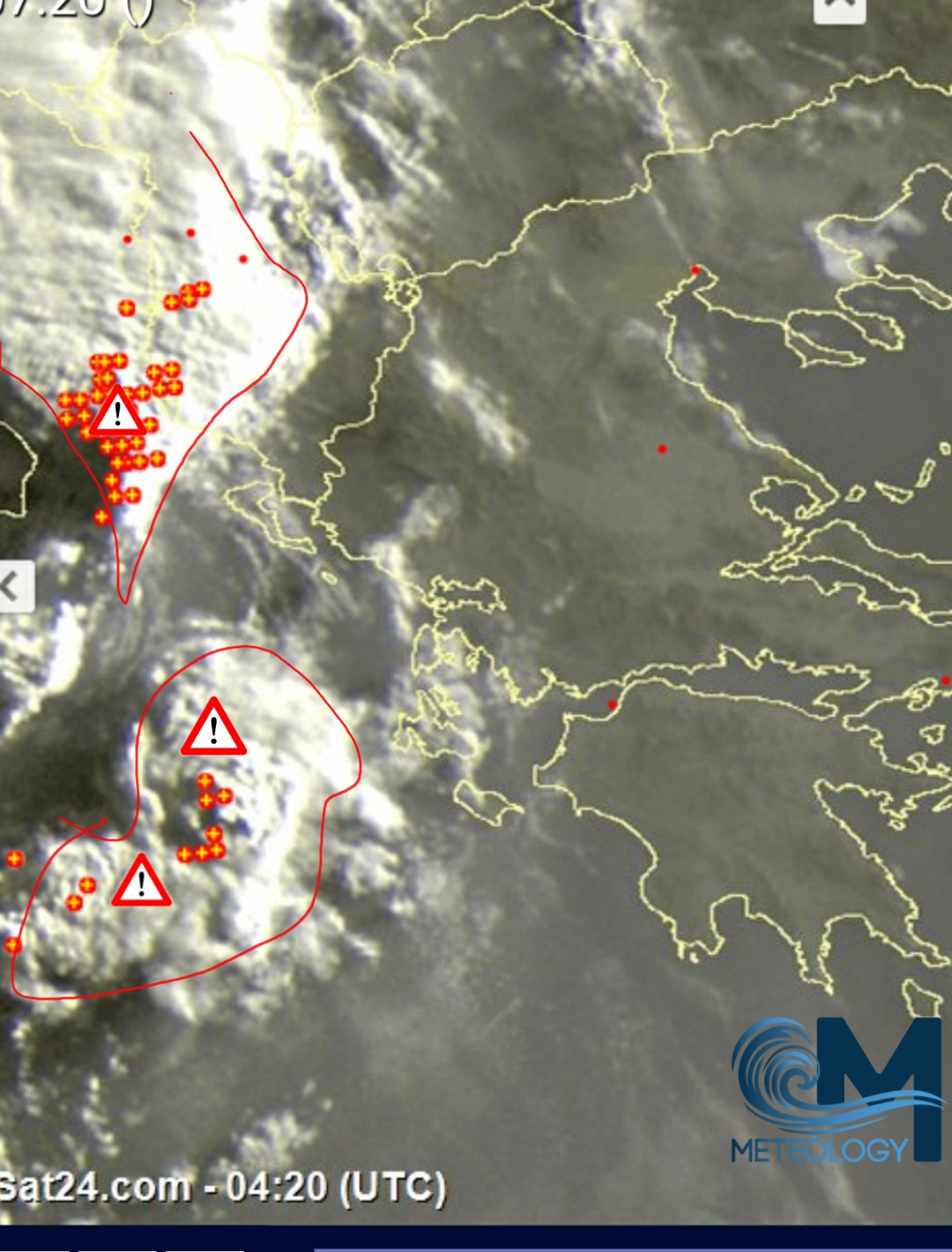 Στην δορυφορική εικόνα παρατηρούμε εκτεταμένα κύτταρα καταιγίδων στο Ιόνιο, τα οποία κινούνται αργά ανατολικά. Τις αμέσως επόμενες ώρες, καταιγίδες σε Επτάνησα και ακτές Ηπείρου.
