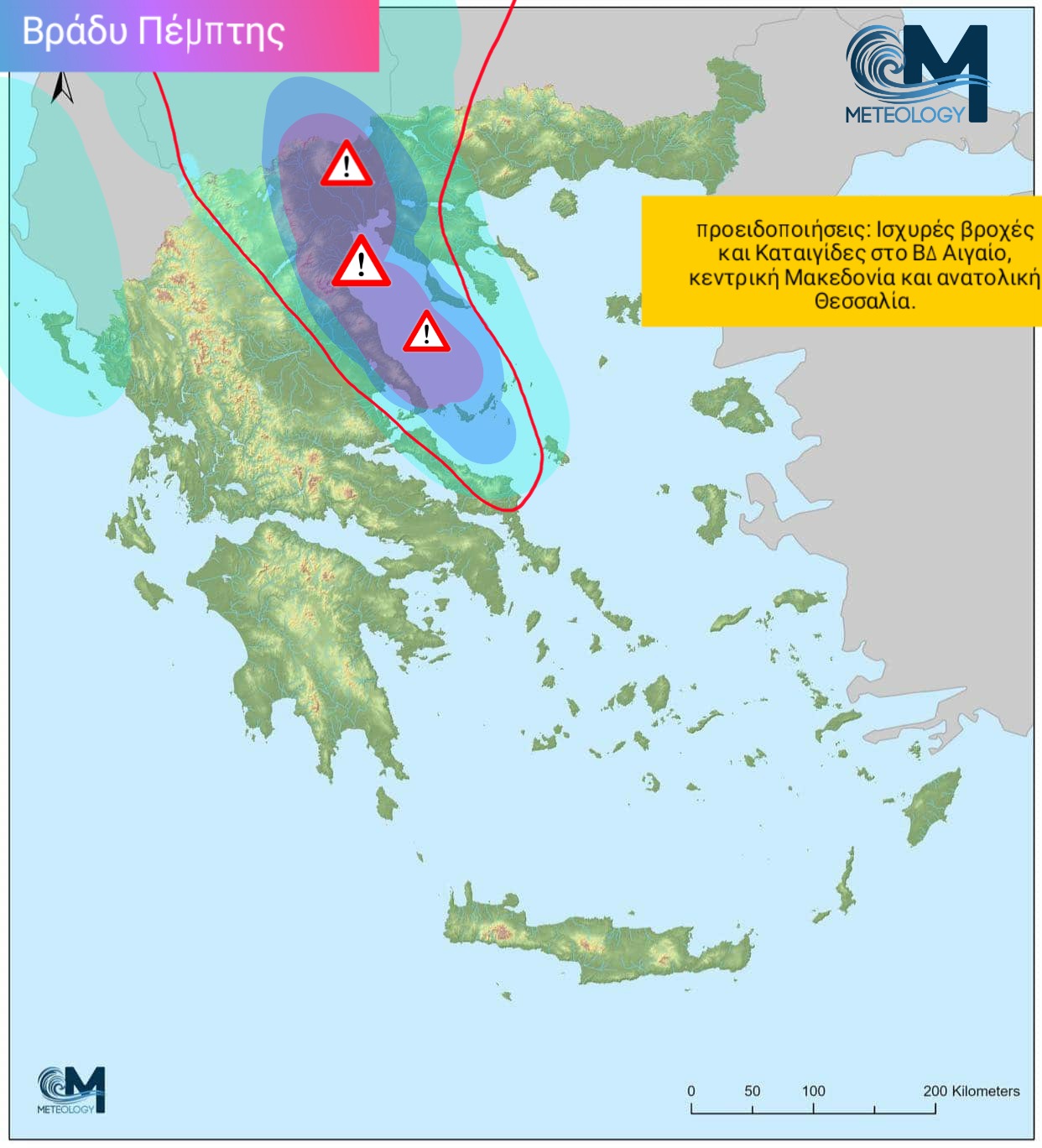 Ένα νέο κύμα βροχών καί καταιγίδων αναμένεται την νύχτα της Πέμπτης προς την Παρασκευή σε κεντρική Μακεδονία, ακτές ΒΔ Αιγαίου και γενικά γύρω από τον Θερμαϊκό κόλπο. Στην ζώνη επιρροής βρίσκεται και η δυτική Χαλκιδική με το πρώτο πόδι. Προς τα ξημερώματα της Παρασκευής θα επηρεαστούν και οι Σποράδες, ανατολική Εύβοια και ανατολική Θεσσαλία. Καταιγίδες την νύχτα και στη Θεσσαλονίκη. Προειδοποιήσεις: Η κύρια απειλή των φαινομένων θα είναι ο μεγάλος όγκος νερού που αναμένεται να πεσει, ικανός να προκαλέσει προβληματα τοπικής κλίμακας από συγκεντρώσεις νερών. Βελτίωση του καιρού προς το πρωί της Παρασκευής.