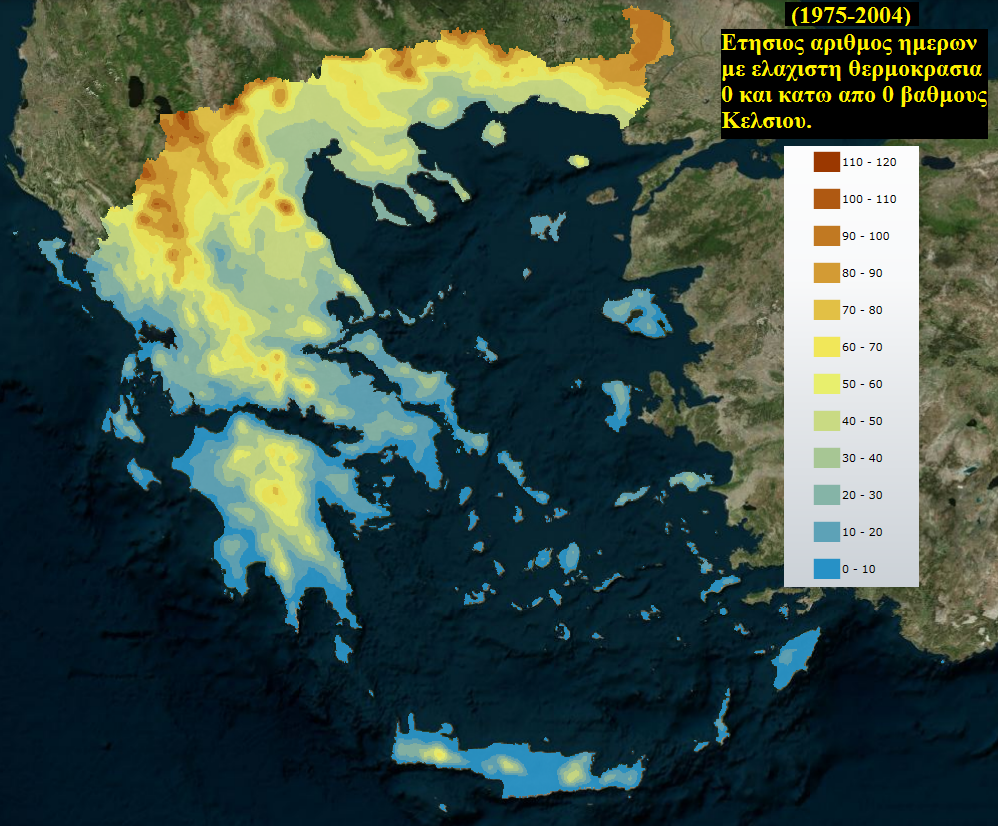 Και ενας χαρτης που δειχνει τον μεσο αριθμο ημερων με παγετο(ημερες οπου η θερμοκρασια ηταν μικροτερη ή ιση απο 0 °C):