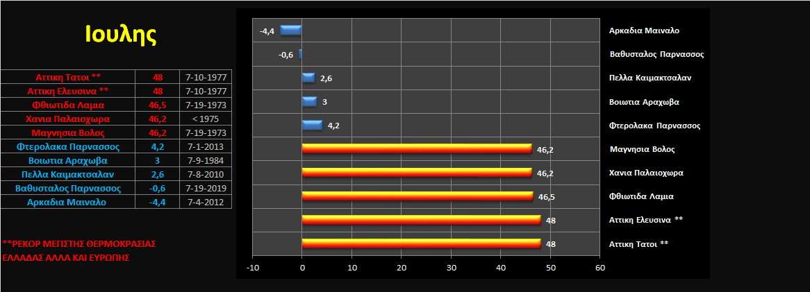Ειναι γνωστο οτι κατεχουμε το πανευρωπαικο ρεκορ υψηλοτερης θερμοκρασιας στην Ευρωπη το οποιο σημειωθηκε(το ιδιο) απο 2 ανεξαρτητους και οχι στην ιδια περιοχη σταθμους κιολας. Αυτο συνεβη στις 10 Ιουλιου 1977 με θερμοκρασιες +48 °C να καταγραφονται στο Τατόι και στην Ελευσινα Αττικης.