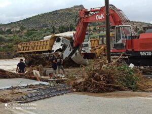 Ήδη χωματουργικά μηχανήματα εργάζονται στο κεντρικό δρόμο προς τα Πολιτικά για να αποκαταστήσουν την κυκλοφορία, ενώ οι διασώστες μεταφέρουν πολίτες ανάμεσά τους και μωρά με σκαπτικά μηχανήματα.