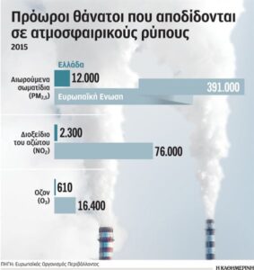 Η Ελλάδα εξακολουθεί να έχει υψηλές τιμές ατμοσφαιρικής ρύπανσης και μεγαλύτερες αναλογικά συνέπειες στη θνησιμότητα. Στις συγκεντρώσεις ΡΜ2,5 αποδίδονται 12.000 πρόωροι θάνατοι στην Ελλάδα το 2015, στο ΝΟ2 2.300 και στο όζον 610. Η επιβάρυνση σε σχέση με την Ε.Ε. φαίνεται στον δείκτη «χαμένα χρόνια ζωής ανά 100.000 κατοίκους». Για τα ΡΜ2,5 στην Ελλάδα είναι 1.112, με μέσο όρο στην Ε.Ε. 820. Για το ΝΟ2 είναι 213 με ευρωπαϊκό μ.ό. 157, ενώ για το όζον είναι 59 έναντι 36. Τα στοιχεία υπογραμμίζουν την ανάγκη να ληφθούν αναβαθμισμένα μέτρα για το σύγχρονο φονικό νέφος.