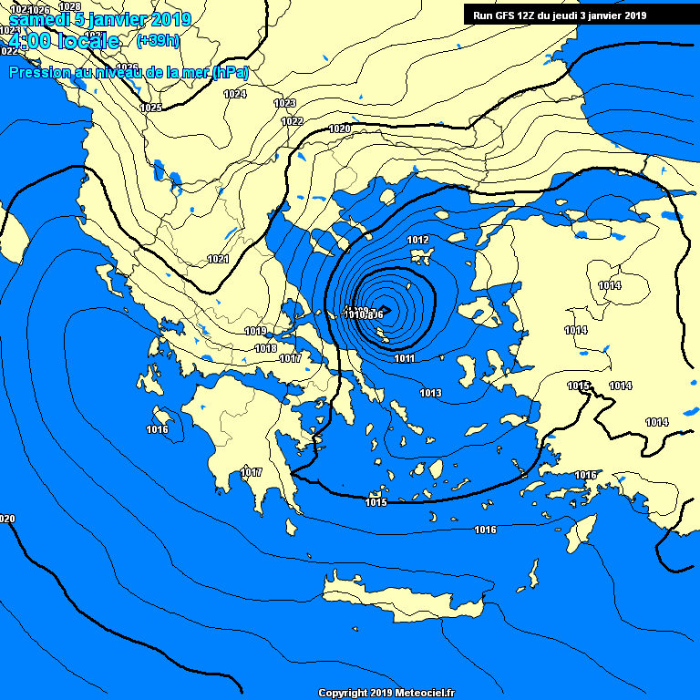 Στον επιφανειακό χάρτη, διακρίνουμε και τον σαφή σχηματισμό αυτού του εκρηκτικού χαμηλού το οποίο θα έχει κατά πάσα πιθανότητα, σαφή χαρακτηριστικά medicane!