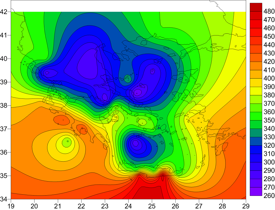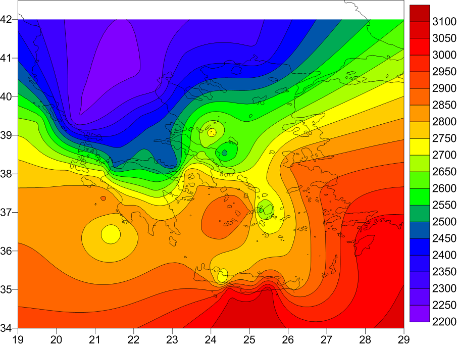 Το αλλο ελαχιστο στην περιοχη της Μηλου ειναι περιεργο να υπαρχει εκει και οφειλεται στο οτι το interpolation επηρεαζεται πολυ απο τις πολυ χαμηλες ωρες ηλιοφανειας που καταγραφηκαν στην Μηλο τον χειμωνα για την περιοδο μετρησεων.