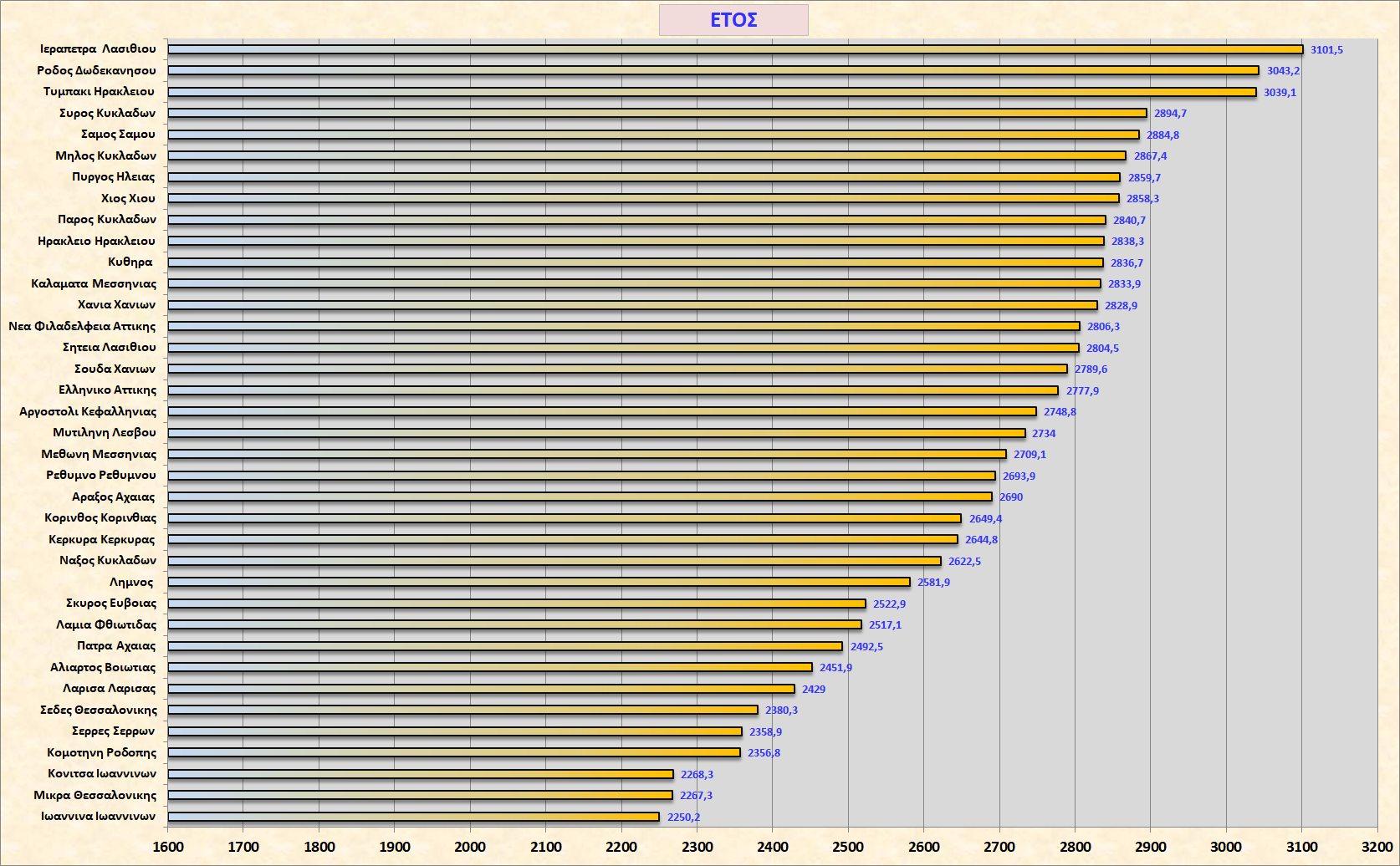 Λαρισα, 4453 ωρες. Εχει δηλαδη το 54.6 % της διαθεσιμης ηλιοφανειας.