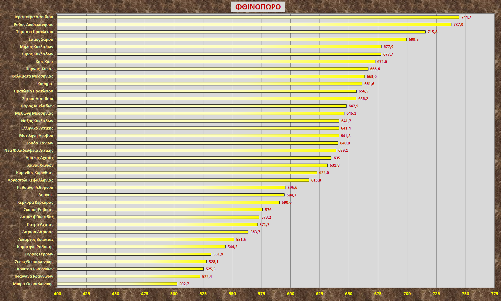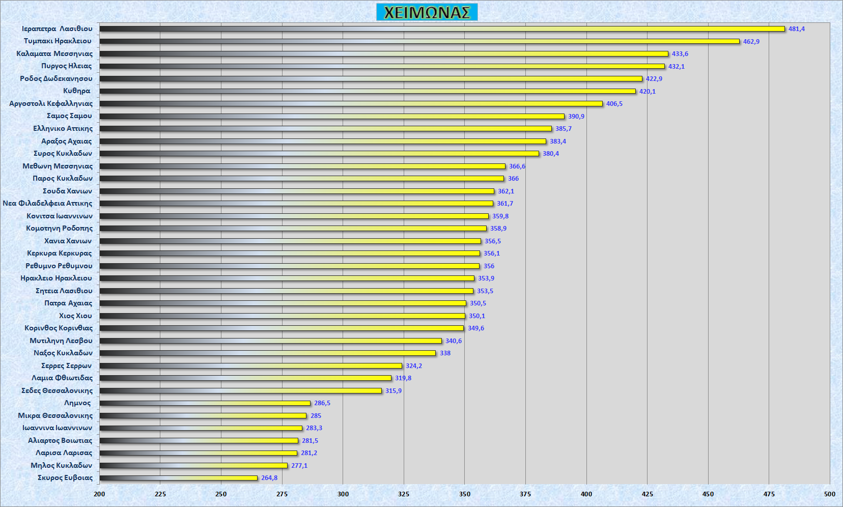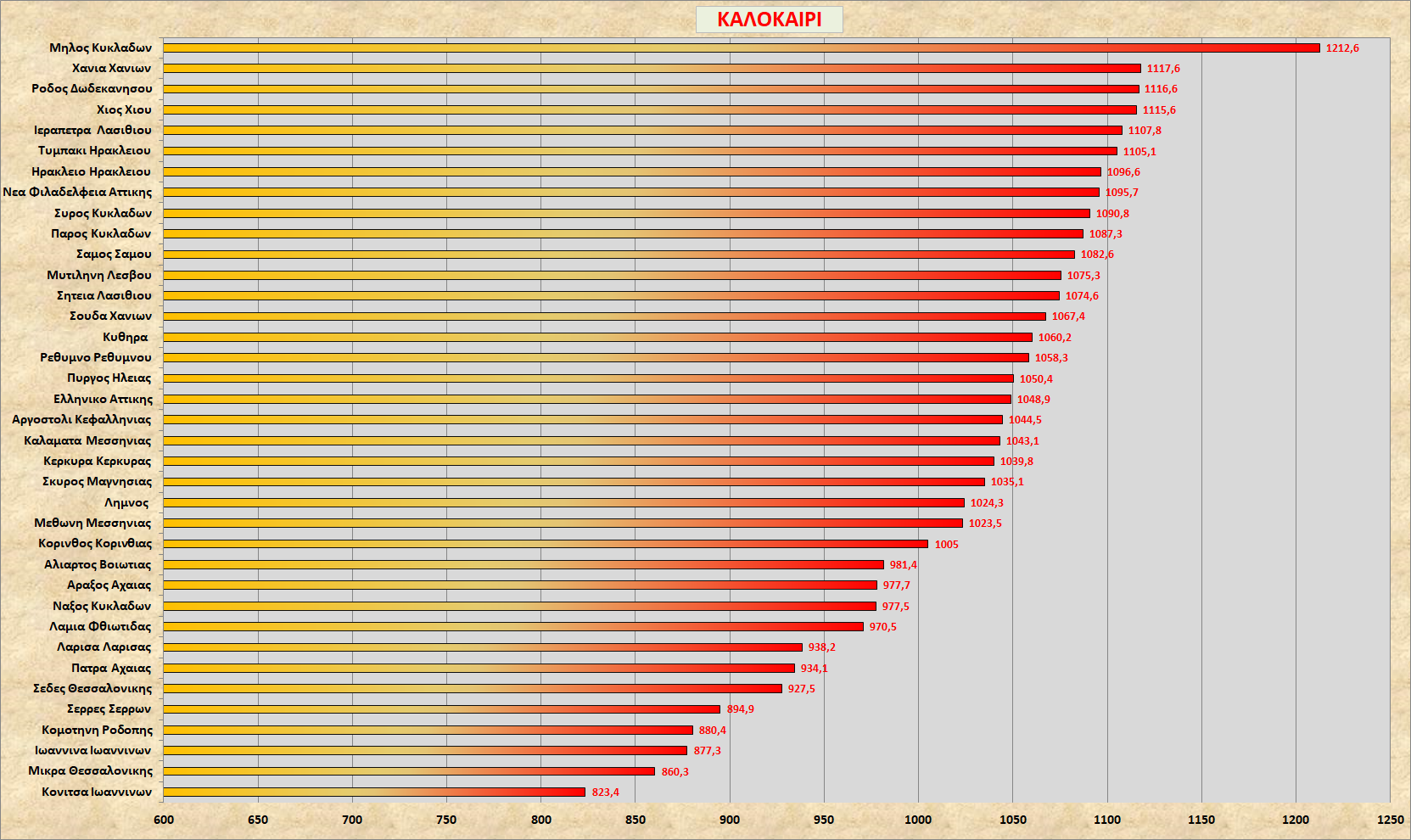 Εκπληξη εδω ειναι η Μηλος που ενω το καλοκαιρι ειχε τις περισσοτερες και με διαφορα ωρες ηλιοφανειας εδω εχει τις λιγοτερες μαζι με την Σκυρο.