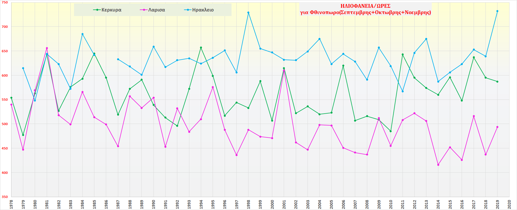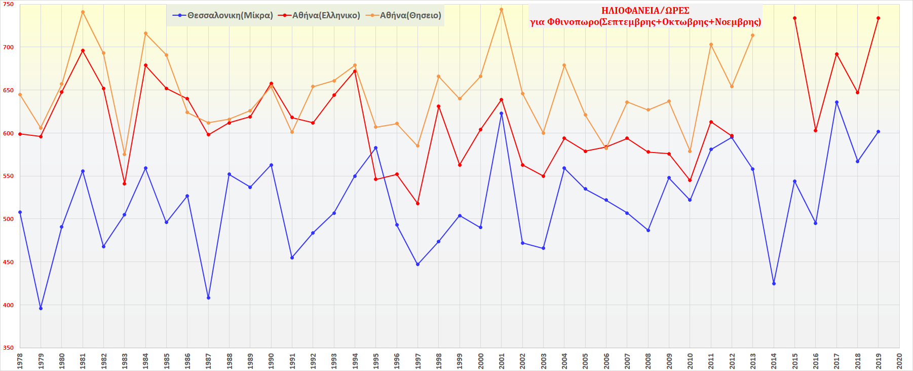 Φθινοπωρο(Σεπτεμβριος+Οκτωβριος+Νοεμβριος) ωρες ηλιοφανειας: