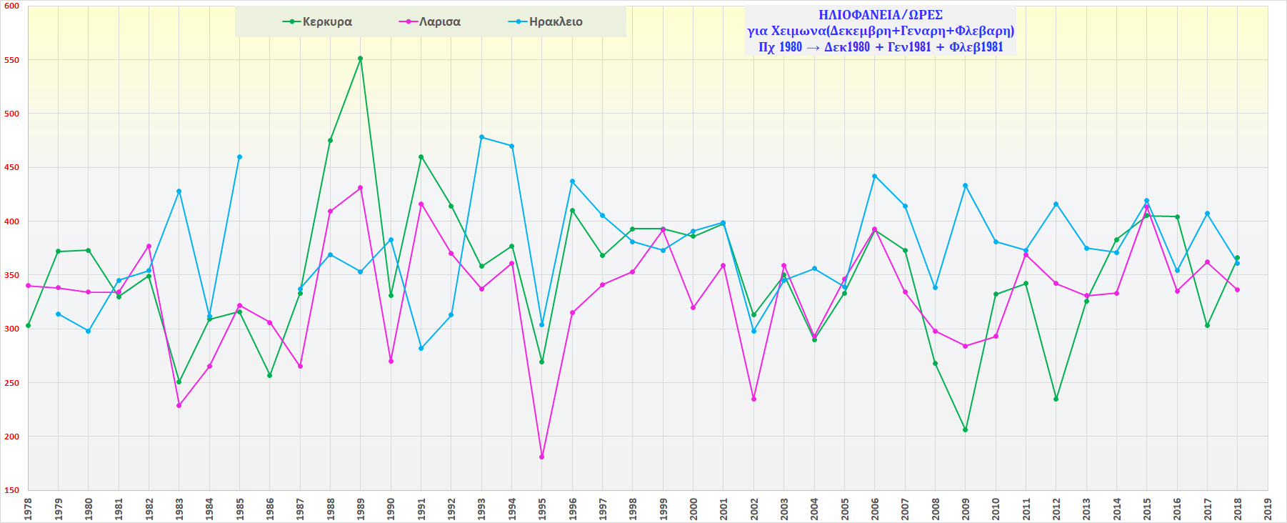Χειμωνας(Δεκεμβριος+Ιανουαριος+Φεβρουαριος) ωρες ηλιοφανειας: