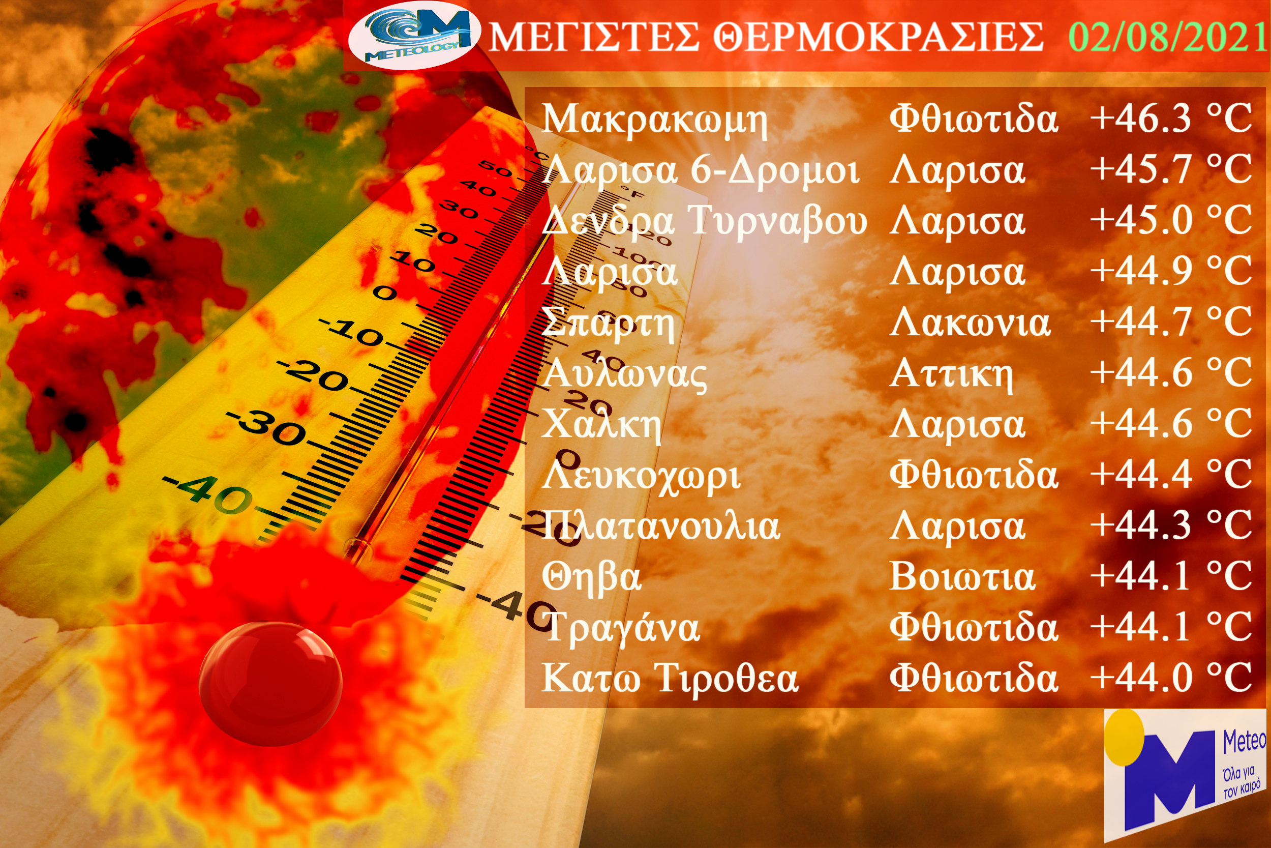 Μεγιστη θερμοκρασια ημερας +46.3 °C στην Μακρακωμη Φθιωτιδας! Που ειναι η 7η μεγαλυτερη (αξιοπιστη) θερμοκρασια ολων των εποχων που καταγραφεται στην Ελλαδα!