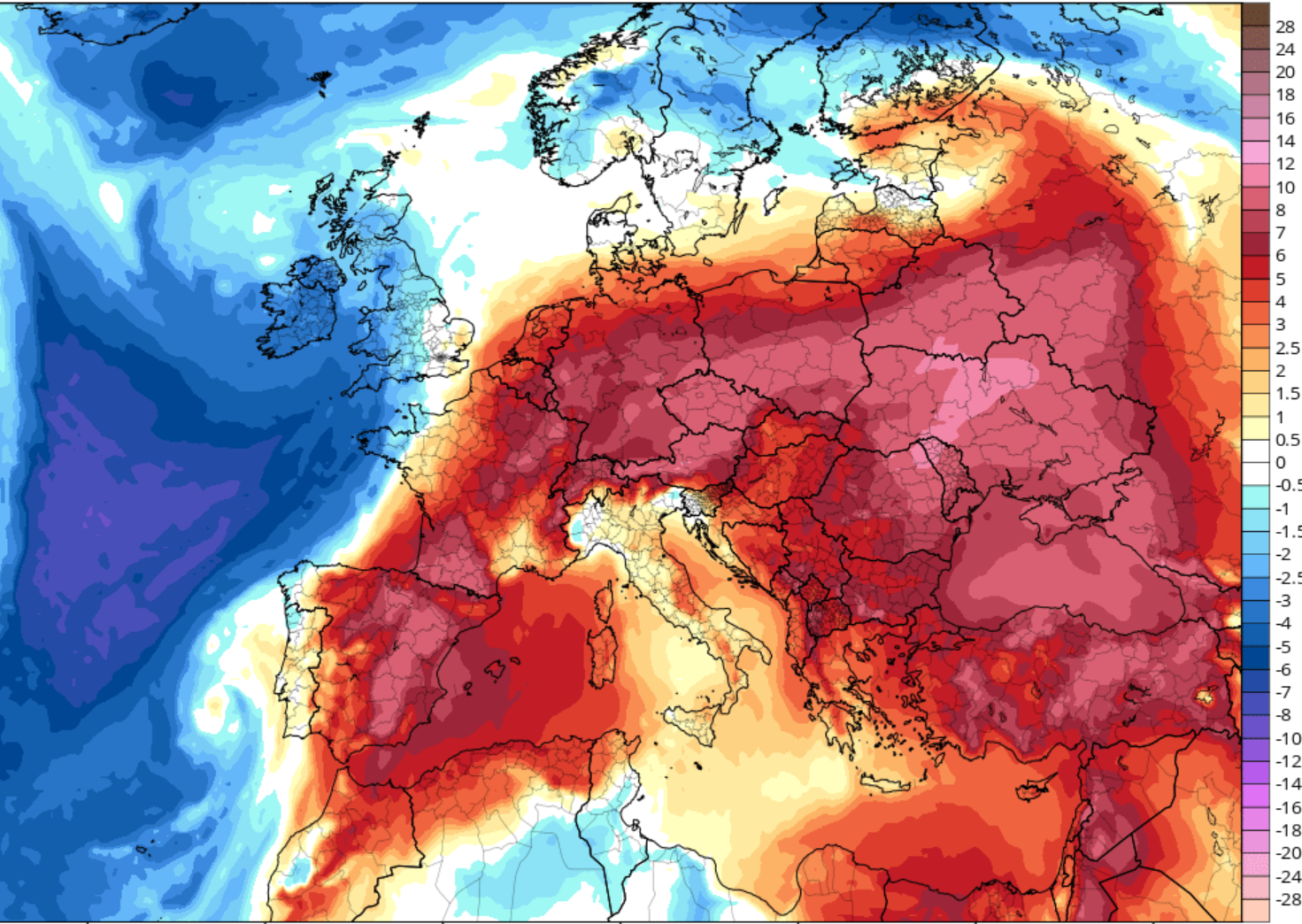 Η παραπάνω εικόνα, ( απόκλιση θερμοκρασιών από τον μέσο όρο) δείχνει ακριβώς το τι θα συμβεί στην Ευρώπη και την χώρα μας τις επόμενες εβδομάδες. Η ράχη αυτή, θα προκαλέσει έντονη καθίζηση αερίων μαζών, κάτι που σημαίνει αύξηση του εύρους θερμοκρασιών μεταξύ ημέρας-νύχτας, πρωινές ομίχλες και πλήρη απουσία βροχών. Αξίζει να σημειωθεί, πως σε πολλές περιοχές, ακόμη και της Γερμανίας, ο υδράργυρος θα ξεπερνά τους 21-23 βαθμούς μέγιστες, κάτι που θα παραπέμπει σε τέλη Μαΐου!