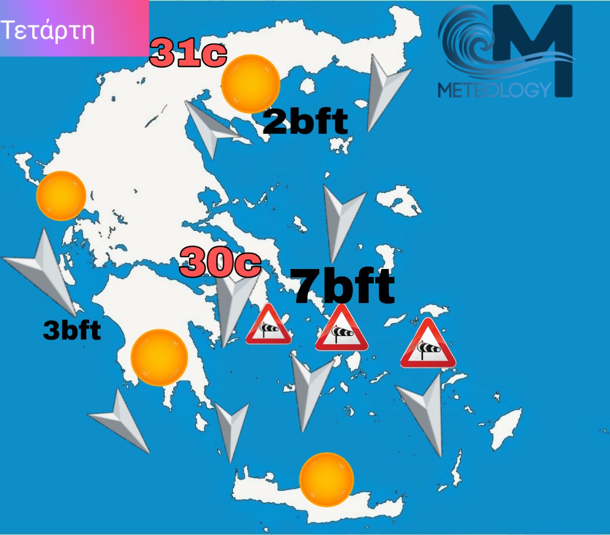 Σημαντική ενίσχυση των βοριάδων στο Αιγαίο θα έχουμε μέσα στην Τετάρτη , ιδιαίτερα στα κεντρικά και νότια τμήματα του. Αξίζει να σημειωθεί πως οι εντάσεις των ανέμων θα φτάσουν και τα 7 μποφόρ στο κεντρικό Αιγαίο! Ανεμώδης η μέρα και στην Αττική, με τον βοριά στα ανατολικά να φτάνει και τα 6 μποφόρ. Στο βόρειο Αιγαίο αντίθετα και ιδιαίτερα στις ακτές της Μακεδονίας , οι άνεμοι θα είναι μεταβλητοί ασθενείς. Η λιακάδα θα κυριαρχεί σε όλη την χώρα!