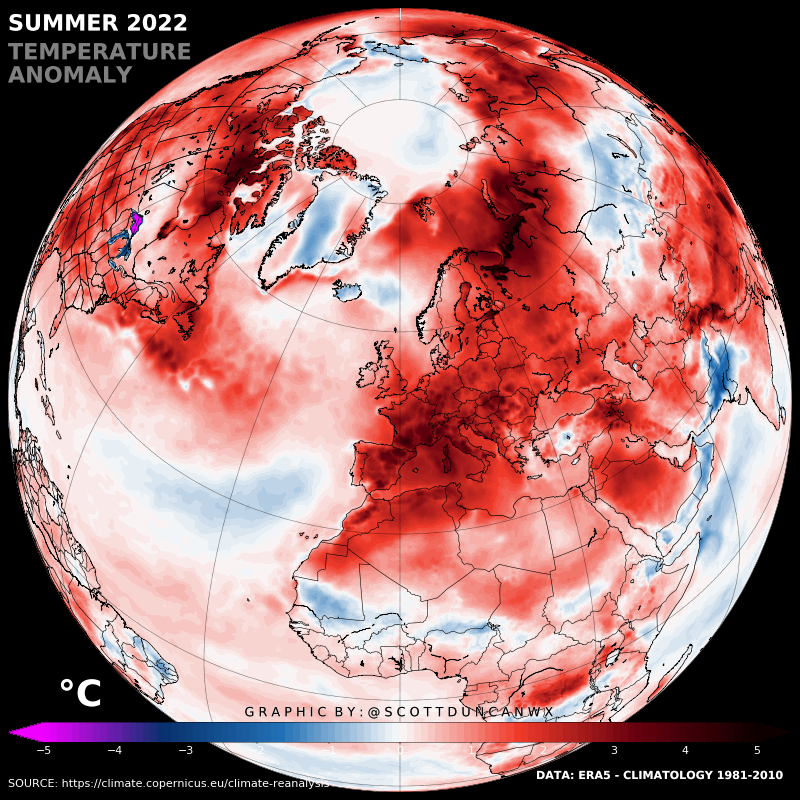 Εν τω μεταξυ το κλιμα της γης συνεχιζει και θερμαινεται και βασει κλιματολογιας ERA5 το φετινο καλοκαιρι 2022(Ιουνιος εως και Αυγουστο) ητανε το πιο θερμο ολων των εποχων για την Ευρωπη.