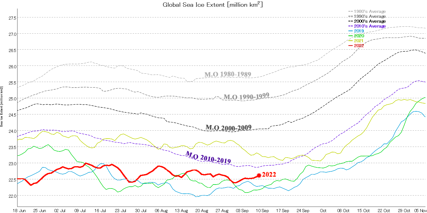 Εκταση παγοκαλυψης σε Αρκτικη και Ανταρκτικη μαζι. Οπως βλεπουμε ειμαστε στο 3ο χειροτερο(μικροτερη παγοκαλυψη) σημειο ολων των εποχων για την περιοδο που υπαρχουν αναλυτικες καταγραφες και πολυ πολυ πιο κατω απο τους μεσου όρους εκτασης παγοκαλυψης των 80ς και 90ς κλπ.