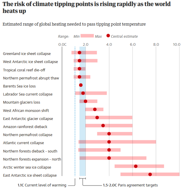 Οπως βλεπουμε απο το διαγραμμα ηδη ακουμπαμε(με την +1.1 °C αυξηση που εχουμε απο την προβιομηχανικη εποχη) στα tipping points των “Παγων στην Γροιλανδια” και των “Παγων στην Δυτικη Ανταρκτικη” στο να ειναι πιθανα αυτα καθως και σε 3 άλλα tipping points.