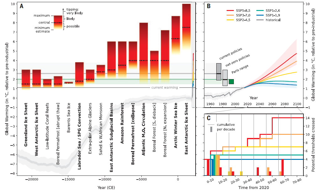 Το νεο paper με τιτλο “Exceeding 1.5°C global warming could trigger multiple climate tipping points” των David I. Armstrong McKay, Arie Staal , F. Abrams, Ricarda Winkelmann ,Boris Sakschewski ,Sina Loriani, Ingo Fetzer , Sarah E. Cornell , Johan Rockström και Timothy M. Lenton, εξετασε και ανελυσε πανω απο 200 μελετες για τα tipping points της γης και καταγραφει 16 πιθανα tipping points στο κλιμα μας(9 πιο γενικα), υπολογιζοντας τα κατωφλια θερμοκρασιων που αυτα χρειαζονται για να πραγματοποιηθουν καθως και τις συνεπειες τους.