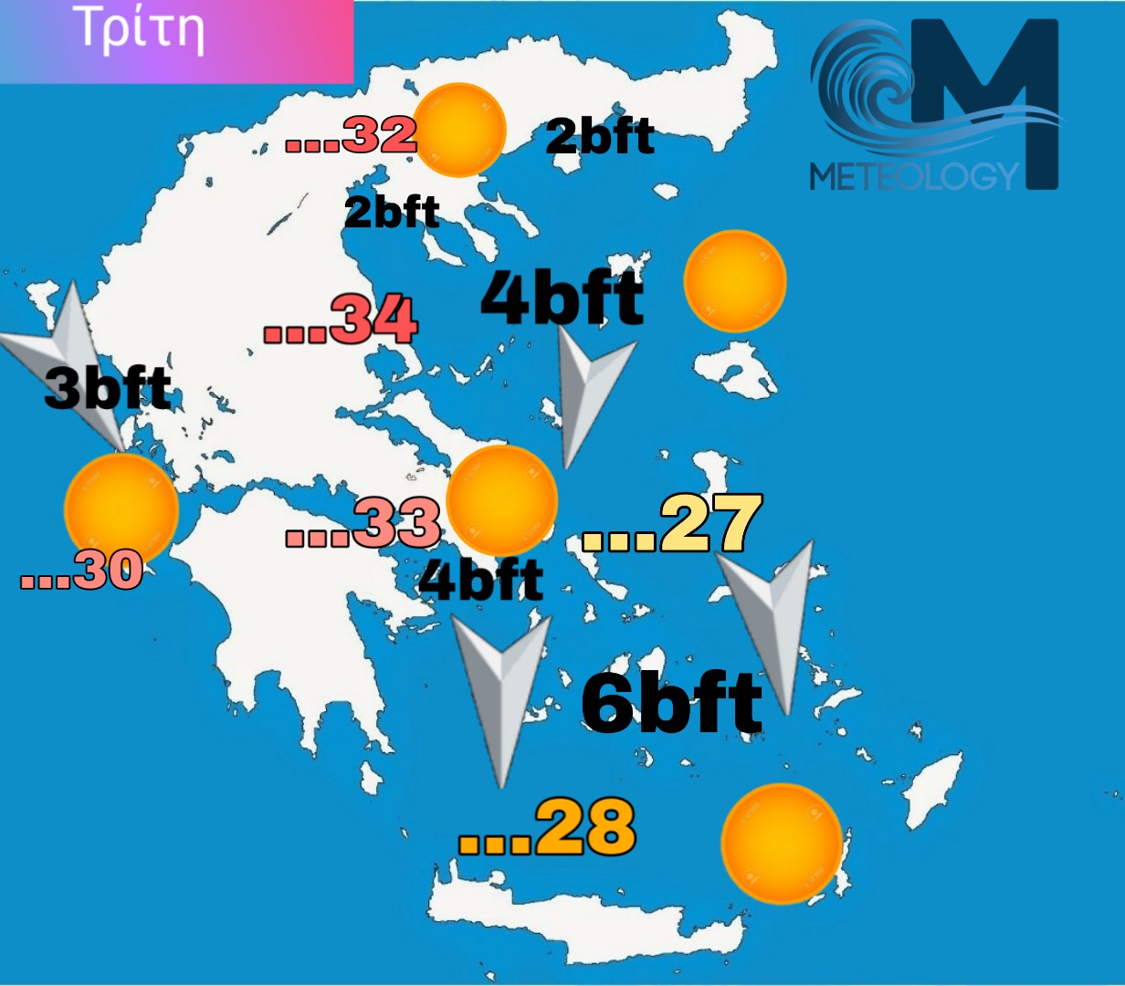 Συνεχίζεται η λιακάδα σε όλη την χώρα και μέσα στην Τρίτη. Κύριο χαρακτηριστικό της ημέρας, η σταδιακή ενίσχυση των βοριάδων στο Αιγαίο, ιδιαίτερα στα κεντρικά και νότια τμήματα του, όπου θα φτάσει και τα 5 ίσως τοπικά και τα 6 μποφόρ, ιδιαίτερα προς Κάρπαθο. Βοριάς και στην Αττική, γύρω στα 3-4 μποφόρ. Η θερμοκρασία σε μικρή άνοδο στα ηπειρωτικά.
