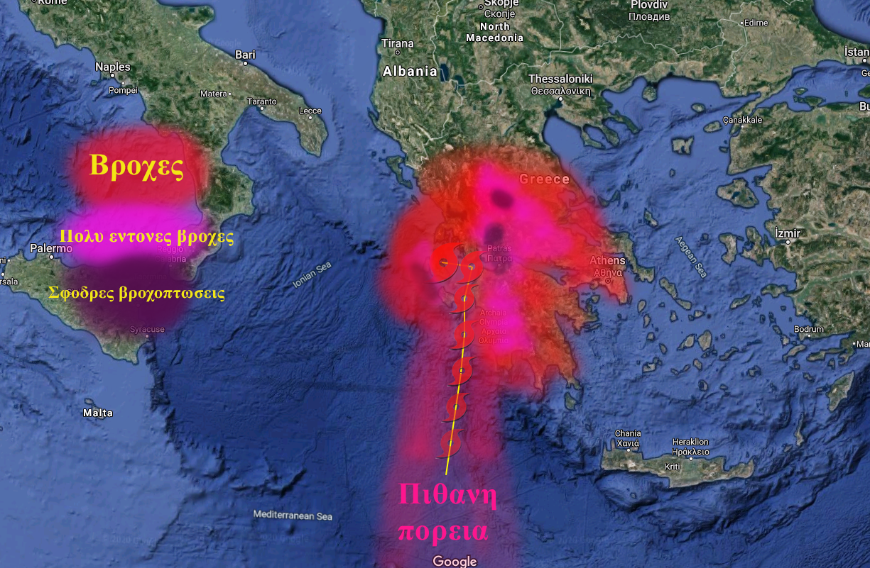 (Να σημειωθει οτι τα παρακατω στοιχεια εντασης βροχοπτωσης και τροχιας του, ειναι ενδεικτικα και ειναι βασει των τωρινων δεδομενων, αφου εξαρτωνται παρα πολυ απο την πορεια του κυκλωνα και οι πορειες των κυκλωνων με τροπικα χαρακτηριστικα στην περιοχη μας ειναι παρα πολυ δυσκολοπροβλεπτες)