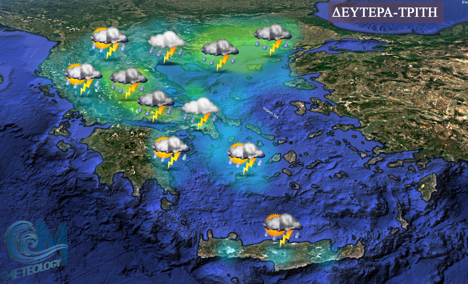 Η μεγαλη ανομβρια που πληττει εδω και μερικους μηνες την νοτια και κεντρικη χωρα καθως και ο πληρως ξηρος Μάιος για εκει εως τωρα, φαινεται να παιρνει μια μικρη ανασα αφου την τελευταια κυριολεκτικα μερα του Μαΐου μαζι με την 1η του νεου μηνα, την ερχομενη Δευτερα και Τριτη δηλαδη, θα εχουμε επισκεψη γενικευμενων βροχων και καταιγιδων στις περισσοτερες περιοχες, με εξαιρεση την δυτικη και νοτια Πελοποννησο, το Ιονιο, το νοτιοανατολικο και κεντροανατολικο(λιγοτερο) Αιγαιο που δεν φαινεται να δεχονται καθολου βροχες.