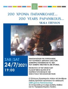 Η αναπαράσταση έγινε προς τιμήν των 200 χρόνων (1821) από την πυρπόληση του τουρκικού δίκροτου από τον Δημήτριο Παπανικολή, στην Σκάλα Ερεσσού Λέσβου.